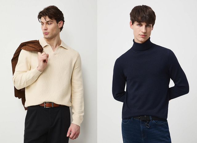 Nejvíce nadčasové jsou střihy s kulatým výstřihem, roláky a modely s výstřihem ve tvaru písmene V. Každý z nich se hodí k jiným outfitům, ale všechny snadno zkombinuješ s džínami, chinos kalhotami nebo klasickými kalhotami.